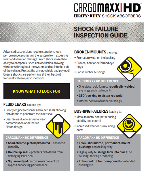 When it’s time to replace shocks, don’t trust anything other than premium replacement components. Ask for CARGOMAXX HD™ shock absorbers. Road-proven in the most extreme conditions, CARGOMAXX HD™ shocks are engineered to meet or exceed OE specifications while offering the ideal solution to withstand the repetitive cycling every truck’s suspension system must endure. Dynamic damping offers best-in-class handling and control, no matter the environment or road conditions. Count on CARGOMAXX HD™ shocks for a smooth ride and maximum cargo protection.
