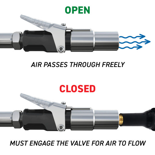 CLOSED FLOW: Must engage the tire valve for air to flow. For use directly from a compressor or air hose.