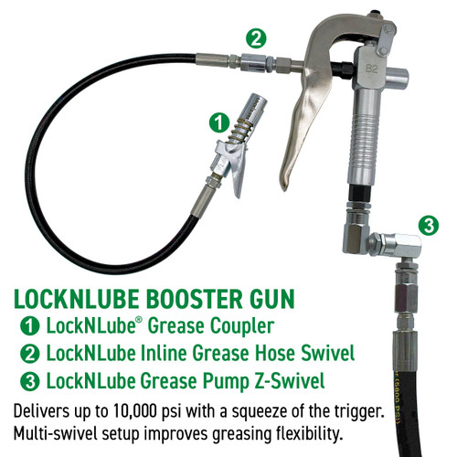 • LockNLube Booster Gun: Leak-free greasing with multi-swivel flexibility.