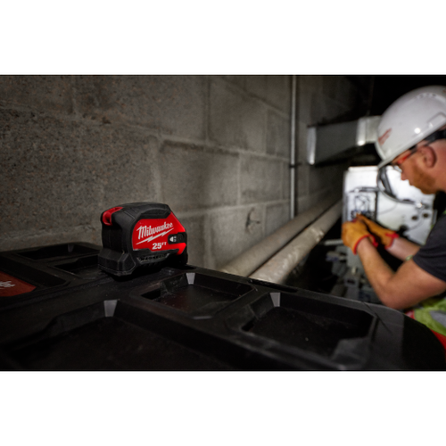 The MILWAUKEE® 25ft Compact Wide Blade Magnetic Tape Measure w/ Rechargeable 100L Light provides the brightest and clearest measuring in the industry. The LED on this 25ft tape measure delivers 100 lumens, providing bright and clear lighting for dimly lit job sites. The 15’ of reach allows you to take long measurements on your own and reach further on the job site. Featuring an impact-resistant lens & frame, and an IP54-rated lens, our LED Tape Measure is constructed to withstand harsh job site conditions. This tape is wear-resistant with nylon blade protection, and an additional anti-tear coating on the first 6” of the blade reduces tape tear. Our finger-stop technology provides greater control of your measurements. This LED Tape is USB rechargeable and delivers up to 2.5 hours of continuous runtime.