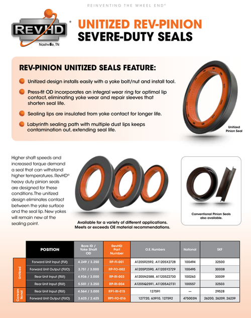 Higher shaft speeds and increased torque demand a seal that can withstand higher temperatures. RevHD heavy duty pinion seals are designed for these conditions.